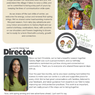 Each issue will be packed with juicy bits of information that we know will matter most to you. From the lowdown on upcoming events that you won’t want to miss, to introductions of our newest staff members who are eager to support and nurture your little ones. We understand the village it takes to raise a child, and we’re committed to being a key part of yours by keeping the lines of communication wide open.